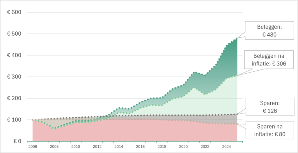 This higher return makes an enormous difference compared to saving in the long term. This is explained by the effect of compound interest: you earn returns on what you earned last year. This way, the difference with saving keeps growing as time progresses.